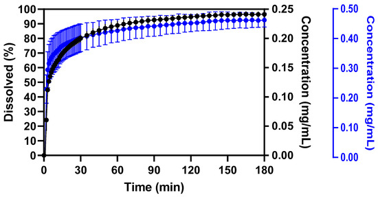 Mini-scale dissolution of the CorA-silica formulation (drug load 50%) (n = 3, mean ± SD). Experimental conditions were set as follows: Dose: 5 mg (●) and 10 mg (●); Volume: 20 mL 0.05 M phosphate buffer (pH 6.8); Paddle speed: 75 RPM; Temperature: 37 °C.
