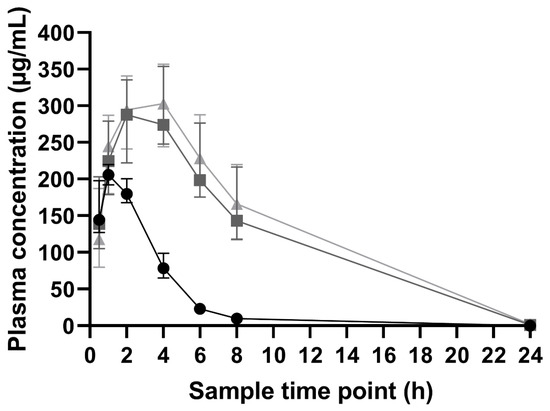 Toxicokinetic profiles of CorA-silica after oral administration in dogs (median ± IQR; n = 4 per group). The dose levels 150 mg/kg (●), 450 mg/kg (■), and 750 mg/kg (▲) were administered as a suspension in 1%-NATROSOL®.