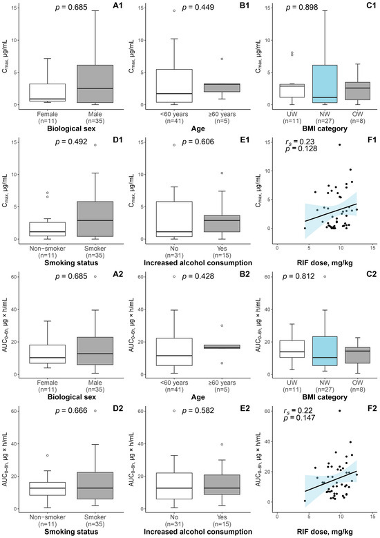 Evaluation of the relationship between RIF PK parameters (1—Cmax; 2—AUC0–6 h) and patient characteristics (A1–E1; A2–E2). The analysis was performed using the Mann–Whitney U test or Kruskal–Wallis test, where applicable. The margins of the boxes illustrate the first (Q1) and third (Q3) quartiles, whereas the median is indicated with a horizontal line within the box. The top and bottom whiskers represent the highest and lowest values within 1.5 times the IQR. Outliers are plotted as empty dots. The relationship between RIF PK parameters and RIF dose (F1; F2) was investigated using the Spearman’s correlation; based on a linear model, a trendline with a blue shaded 95% CI was added. The black filled dots are individual measurements. A p-value < 0.05 was considered statistically significant. Abbreviations: IQR—interquartile range; BMI—body mass index; RIF—rifampicin; Cmax—peak plasma concentration at 2 h; AUC0–6 h—area under the time–concentration curve from 0 to 6 h post-dose; UW—underweight (BMI < 18.5 kg/m2); NW—normal weight (18.5 kg/m2 < BMI ≤ 25.0 kg/m2); OW—overweight (BMI ≥ 25.0 kg/m2); rs = Spearman’s correlation coefficient.