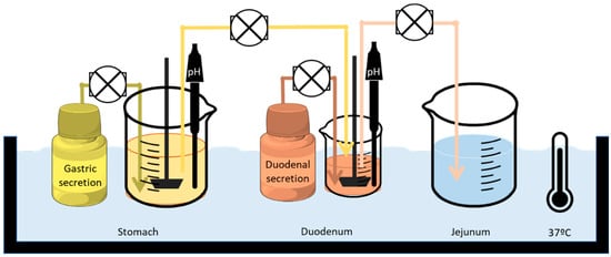 The transfer rate from the stomach to the duodenum was set as a first-order kinetic process with a gastric half-life of 8 min, in accordance with human data [11,12]. The volume of the stomach was decreasing from 300 mL to 10 mL. The stomach received acid secretions from a reservoir at a fixed rate (1 mL/min). The second chamber represented the duodenum, whose volume remained constant at 50 mL. The duodenum received the contents of the stomach and buffer solution at the desired pH at 1 mL/min. The output pump balanced its speed with the inputs so that the volume remained constant. The last chamber represented the jejunum. This compartment was empty at the beginning of the experiment, and it was the final accumulative receiver. To sum up, there were five compartments—stomach, duodenum, jejunum, and two reservoirs of secretion fluids—and all of them were connected by four pumps (Ismatec REGLO pump; IDEX Health and Science, Glattbrugg, Switzerland). All the peristaltic pumps were calibrated prior to the start of the experiment. All the compartments were in a thermostatic bath at 37 °C. The dissolution vessels were stirred with paddles (Muscle Corp., Osaka, Japan) at a rate that operated discontinuously—quickly for five seconds and slowly for 25 s. In such a setup, pH meters could also be inserted for continuous pH measuring.