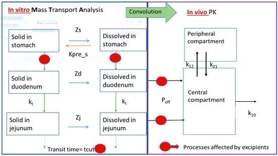 The purpose of physiologically based pharmacokinetic modeling (PBPK) for biopharmaceutical applications (PBBM) is to combine biopredictive dissolution/dissolution modeling and/or other in vitro testing parameters with PBPK modeling strategies to quantitatively describe (or characterize) the potential interactions of formulation variants with the organism and their effect on drug exposure. This modeling approach should include relevant mechanisms related to the absorption process, such as the local metabolism in the gastrointestinal tract (if applicable), drug transport properties, gastrointestinal transit, food state, etc., and incorporate a drug product’s quality properties to predict systemic drug exposure. This approach is the one contained in a recent FDA draft guidance that indicates how modeling can construct a safe space for variations in critical biopharmaceutical attributes [6,7]. This approach is not limited to the construction of IVIVCs, in which the in vivo dissolution process is the limiting step of absorption which can be captured in an in vitro dissolution test, both linked with a mathematical model. For BCS class III and some class IV drugs containing immediate-release (IR) products, establishing an IVIVC is challenging or unattainable, as permeability, instead of dissolution, is the limiting factor for systemic exposure.