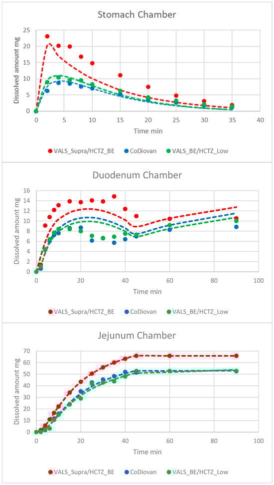 Figure 3 depicts the average VALS dissolved amounts (four tablets per formulation) in the three chambers from the assayed products. The fitted values to the PBPK model were represented with dashed lines.