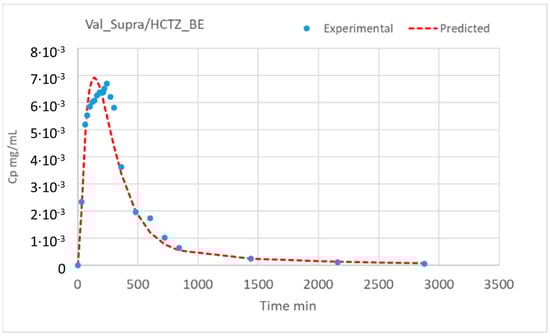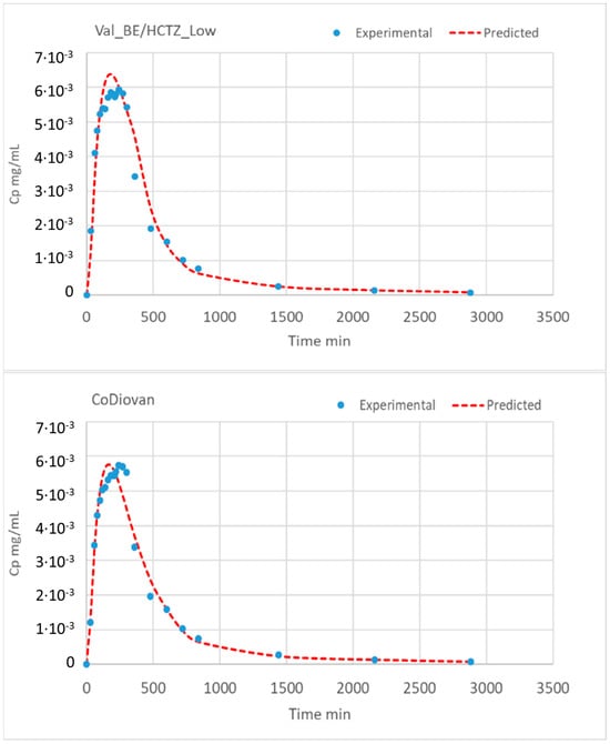 The gastric emptying times were shortened (from 15 to 13 min) for the VALS_Supra/HCTZ BE formulation. These gastric emptying times were based on previous human intubation studies (13 min) with a 2 min delay in the formulation containing more sorbitol, based on the AUC and Cmax ratio differences for the HCTZ in both test products. The total transit time in the absorption window (quantified with tcut) was reduced from 600 min to 360 min for VALS_BE/HCTZ_Low. The precipitation and dissolution parameters from the in vitro model were used as the initial estimates in the PBBM, and the final parameters were compared with the initial ones to estimate an average common scaling factor between the in vitro and in vivo parameters. The scaling factors and the final in vivo dissolution/precipitation parameters are displayed in Table 7. These parameters were used to simulate the in vivo plasma concentration–time profiles using as input the in vitro dissolution profiles in the GIS. The model equations are detailed in the Supplementary Materials Section. The experimental and simulated plasma profiles are illustrated in Figure 4.