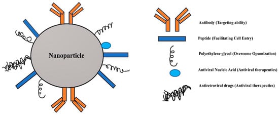 By the genetic modification of naturally occurring extracellular vesicles with a single chain variable fragment antibody (Ab) component, which has strong binding with gp140 produced on the infected cell surface, nano-formulations are incorporated with supplementary target delivery moiety []. The vesicles are injected with curcumin or miR-143 (miRNA-143), a substance that triggers apoptosis, in order to eradicate the particular reservoir of the virus. With HIV-infected cell lines, PBMCs taken from HIV-1-positive patients, and in an animal model with a solid tissue reservoir, the approach demonstrated remarkable efficiency in vitro. Platelet microparticles that deliver lamivudine or tenofovir are different platforms based on biomimetic membrane vesicles which are employed in HIV-1 suppression []. Figure 1 depicts NPs as anti-HIV therapy.