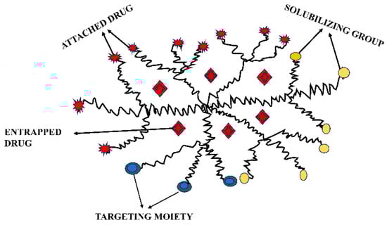 Furthermore, for reactivating the cytotoxic T cell pool, lipid-coated PLGA nanoparticles laden with different agents that can reverse latency, like JQ1 or ingenol-3-angelate, have been chemically attached with an anti-CD4 monoclonal Ab via maleimide–thiol click chemistry []. The CD4+ T cells were vulnerable to being destroyed by additional antiviral treatments when they were reactivated. When injected subcutaneously into mice, the anti-CD4-functionalized NPs demonstrated a more than two-fold selective deposition in lymphatic cells as compared to the nontargeted formulation. Figure 2 depicts a polymeric dendrimer targeting HIV.