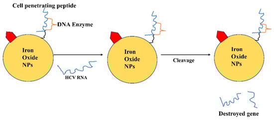 Iron oxide NPs can target hepatocyte receptors like asialoglycoprotein and HA receptors for delivery to hepatocytes. Since it is extremely difficult to find new medications for the treatment of HCV, ongoing research is being conducted to reduce the off-target effects and toxicities associated with the medications that are currently on the market, as well as to enhance delivery methods using emerging technologies like nanotechnology. For this method, several kinds of lipid, metallic, and polymeric NPs were used and investigated. Several NPs with HA and HA decoration were created with the express purpose of targeting liver cells []. When HCV infects hepatocytes, RBV (ribonucleoside analogue) exhibits antiviral action. On the other hand, it heavily accumulates in red blood cells (RBCs), which leads to hemolytic anemia when used frequently []. Modifying RBV dispersion by nanotechnology has been thoroughly researched in order to reduce RBC absorption. In polymeric NPs made of poly (D, L-lactic acid; PLA) as well as arabinogalactanpoly (L-lysine; AG-PLL), RBV monophosphate (RMP, prodrug) was steadily loaded. Without causing a large amount of drug release into the bloodstream or accumulation of RBV in erythrocytes, the carrier was able to precisely deliver the medication to the liver. The polymer concentration of arabinogalactan (AG), a polysaccharide with Gal side chains, was the cause of liver targeting. Hepatocytes’ asialoglycoprotein receptor is specifically bound by gal-decorated NPs, causing endocytosis and the release of cargo from inside the liver cells []. Figure 3 depicts iron oxide NPs with DNAzyme to target the HCV replication.