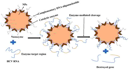 Researchers have also created Gal-decorated NPs to deliver RBV to the liver with little cytotoxicity, all without the need for PLL []. The interaction between PLA and the poly (L-glutamic acid)/AG [PLG–AG] conjugate produced these NPs. There have been reports of other polymeric NPs based on poly (glycerol adipate) (PGA) as an RBV delivery system that targets the liver and reduces RBC buildup. According to this study, NP absorption was substantially greater in HCV-infected cells than in nonviral-infected cells. Additionally, galactosylated-α,β-poly(N-2-hydroxyethyl){[(2-aminoethyl carbamate)] was loaded with the tripalmitate prodrug of RBV. The prodrug’s entrapment efficiency is enhanced by the -co-[2-(1,2-dipalmitoylsn-glycero-3-phosphoethanolamine-N-succinyl)-amidoethylcarbamate]}-D,L-aspartame (PHEA-EDA-DPPEGAL) copolymer because of its high hydrophobicity []. Researchers have created a customized nanozyme (48 ± 2 nm, 14 ± 1 mV) with AuNPs as the core and two neighboring components as the shell: endoribonuclease (RNase A), which is complementary to the target HCV RNA at 322–339 nucleotides, and DNA oligonucleotide, which can cut HCV RNA []. A test using nanozyme RNase activity revealed that the enzymes worked along with oligonucleotides to specifically target and cleave HCV RNA into two pieces according to particular sequence and location requirements, resulting in a 99.9% reduction in HCV RNA levels. Consequently, these intracellular nanomachines are powerful treatments against HCV through significant cooperative mechanisms, together with strong target stability and safety. With a superior safety profile and patient compliance than interferon-based regimens, DAAs were able to completely transform the treatment of HCV. When using DAAs, a few mild adverse medication responses, such as headache, gastrointestinal problems, and exhaustion, have been documented [,]. Widespread use of these medicines against various genotypes has been approved by the FDA []. Figure 4 illustrates a functionalized nano enzyme used to target the hepatitis C virus.