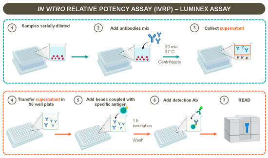 The IVRP assay is a multiplex-based assay that relies on monoclonal antibodies directed against specific epitopes in the formulated vaccine. After the initial incubation phase, in which the mAbs recognize the specific epitope on the antigen, the free mAbs that do not react with the vaccine are isolated via centrifugation and quantified by using an indirect assay. The relative potency is measured using a parallel line model in which the inhibition curve obtained with respect to a reference batch with known potency (test batch) is compared to the sample.