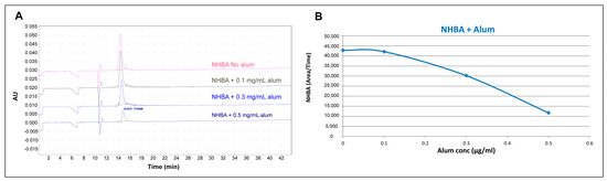 The correct peak area (measured as the ratio between the peak area and its migration time) was monitored to assess whether the presence of alum had an impact on the antigen peak. In addition, the corrected peak area of the non-adsorbed NHBA is directly correlated to its amount (quantitative measure).