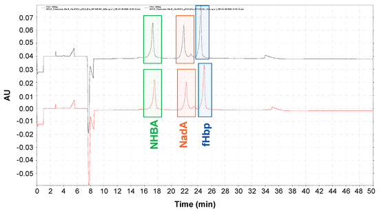 The optimization of the assay was carried out by analyzing the combination of the three selected recombinant proteins in the same formulation (NHBA, NadA, and fHbP). The three recombinant proteins were mixed at 0.1 mg/mL each, without aluminum. Under the new electrophoretic conditions, a good resolution was obtained, and all the three recombinant proteins were detected with a good peak shape (Figure 4).