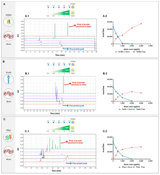 (A) A.1 The electropherogram profiles on NHBA, with alum at different concentrations (from bottom to the top: no alum, alum 0.3, 0.5, 1, 2, 3 mg/mL), A.2 The trend of corrected areas in function of alum concentration. (B) B.1 The electropherogram profiles on NadA, with alum at different concentrations (from bottom to the top: alum 0.3, 0.5, 1, 2, 3 mg/mL), B.2 The trend of corrected areas in function of alum concentration. (C) C.1 The electropherogram profiles on fHbp, with alum at different concentrations (from bottom to the top: alum 0.3, 0.5, 1, 2, 3 mg/mL), C.2 The trend of corrected areas in function of alum concentration. To evaluate the trend of corrected areas of each antigen, where multiple signals are present, as the value, the sum of all signals observed was considered.