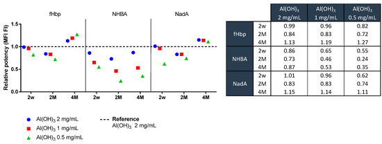 Representation of relative potency (RP) data obtained at three different time points for multivalent formulations (fHbp; NHBA; NadA) at different alum concentrations. The data were divided for each antigen at the different time points (2 weeks, 2 months, 4 months). The formulations at alum concentrations (2.0, 1.0, 0.5 mg/mL) were tested against the formulation at 3.0 mg/mL. The reference as such has an RP = 1 represented in the graph with a dotted line. Table reports the RP values obtained for each antigen.