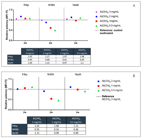 (A) Relative potency (RP) for freshly multivalent formulations (fHbp; NHBA; NadA) at different alum concentrations. The relative potencies for each antigen in the presence of different alum concentrations (3, 2, 1, 0.5 mg/mL) were compared to the RP = 1 reference old multivalent formulate at 3.0 mg/mL. The data shown as the freshly 3.0 mg/mL formulate presents the same potency of the old. Table reports the RP values obtained for each antigen. (B) Relative potency (RP) for freshly multivalent formulations (fHbp; NHBA; NadA) at different alum concentrations. The relative potency for each antigen in the presence of different alum concentrations (2, 1, 0.5 mg/mL) were compared to the RP = 1 reference freshly multivalent formulate at 3.0 mg/mL. Table reports the RP values obtained for each antigen.