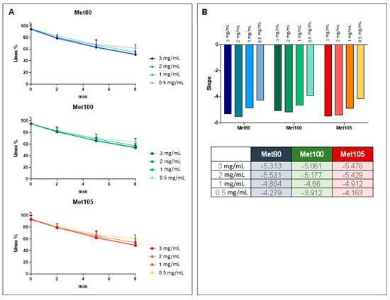 Comparison of NHBA formulations at different alum concentrations (3.0, 2.0, 1.0, 0.5 mg/mL). (A) Details of the oxidation rate of the three methionine residues 80, 100, and 105 are shown at the top as linear regression plots. (B) The slopes of the oxidation rate of the methionine residues are represented in barrel plots in the lower part, where the numerical values of the linear slopes for the three methionine residues are shown. A higher value corresponds to greater accessibility to the solvent.