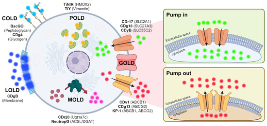 Discriminating between cell types is a crucial step in understanding complex biological events. While antibodies are commonly used to differentiate cell types, their recognition is limited to surface markers. In contrast, fluorescent small molecules can easily penetrate cells without causing significant disruption and can detect intracellular biomarkers [1,2,3,4,5]. Motivated by the identification of a vast array of potential targets using fluorescent chemicals, our group has established Diversity-Oriented Fluorescence Library (DOFL) to extend the scope of detection. Through this initiative, we have made substantial contributions to the field, having developed over 30 bioprobes (Figure 1) [6]. Conventionally, fluorescent probe development focuses on binding to proteins, a method we termed Protein-Oriented Live-cell Distinction (POLD) [7,8,9,10]. Throughout the procedure, the protein-binding system encounters limitations in explaining the journey of fluorescent molecules, particularly in the absence of protein partners. As an alternative approach, we have shifted and expanded our perspectives to a novel strategy [11]. We realized that some probes can target molecules outside of cells by staining carbohydrates (Carbohydrate-Oriented Live-cell Distinction: COLD) [12] or membranes (Lipid-Oriented Live-cell Distinction: LOLD) [13]. The representative example of LOLD is CDgB [14], exhibiting selectivity to B over T cells based on membrane flexibility. Furthermore, we found that other probes can serve as substrates for specific enzymes, acting as turn-on sensors. This mechanism, termed Metabolism-Oriented Live-cell Distinction (MOLD) [15], offers different perspectives. In addition to these mechanisms, we have explored a distinct strategy involving transporters that do not require specific partners inside the cells. Considering the wide range of substrates transferred by transporters, it would be plausible to consider them as potential gating partners for selective probes [16]. Transporters are broadly classified into solute carrier (SLC) and ATP-binding cassette (ABC) families. SLC transporters primarily facilitate the uptake of small molecules into cells (pump in) [17], while ABC transporters are responsible for exporting substrates to the extracellular space (pump out) [18]. Leveraging transporter-dependent mechanisms, we have developed several selective bioprobes [11]; the mechanisms reliant on the transporters uncovered have not fully encompassed all transporter pools yet.