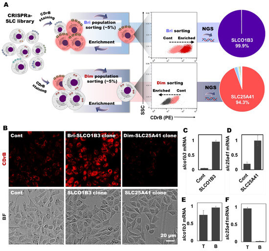 The following supporting information can be downloaded at https://www.mdpi.com/article/10.3390/pharmaceutics16030424/s1: Figure S1. Fluorescence enrichment of the CDrB-stained SLC-CRISPRa and sorted out brighter populations. The SLC-CRISPRa library was stained using CDrB (0.5 μM). After 30 min, ~3% brighter populations were sorted out, and the processes were repeated until a ~95% enrichment was achieved compared to the control library. The gating strategy is described in the Materials and Methods section. Figure S2. Fluorescence enrichment of the CDrB-stained SLC-CRISPRa and sorted out dimmer populations. The SLC-CRISPRa library was stained using CDrB (0.5 μM). After 30 min, ~3% dimmer populations were sorted out, and the processes were repeated until a ~95% enrichment was achieved compared to the control library. The gating strategy is described in the Materials and Methods section. Figure S3. Single-cell cloning for slco1b3. After the enrichment of brighter populations in SLC-CRISPRa pools, single-cell cloning was carried out. A total of 31 clones were identified, and 7 clones showed higher expression levels of slco1b3 compared to the others. Figure S4. Single-cell cloning for slc25a41. After the enrichment of dimmer populations in SLC-CRISPRa pools, single-cell cloning was carried out. A total of 31 clones were identified, and 16 clones showed higher expression levels of slc25a41 compared to the others. Figure S5. Localization of CDrB. The cells were stained with Mitotracker deep red (100 nM) after staining CDrB (1 μM). A correlation graph is displayed with Pearson’s correlation coefficient (0.71). Figure S6. LC and mass chromatogram of CDrB. Figure S7. 1H NMR of CDrB (850 MHz, MeOH-d4). Figure S8. 1H-1H COSY of CDrB (850 MHz, MeOH-d4). Figure S9. 13C NMR spectrum of CDrB (214 MHz, MeOH-d4). Figure S10. Absorbance and fluorescence spectra of CDrB in MeOH. The displayed graph shows the absorbance and emission spectra of CDrB. The table contains the information of the extinction coefficient and quantum yield of CDrB, which were measured in methanol. The emission spectrum was measured using λex = 550 nm.