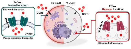 Proposed mechanism of CDrB. CDrB is taken up by SLCO1B3 within the cells, expresses in both T and B lymphocytes, and localizes within the mitochondria. However, T cells, which overexpress SLC25A41 compared to B lymphocytes, actively efflux CDrB. Based on this phenomenon, we hypothesize that SLC25A41 exhibits reversible localization to properly expel its substrate, in contrast to the inward positioning of the influx transporter SLCO1B3.