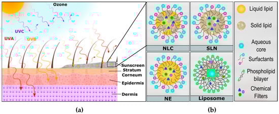 (a) Scheme describing the interaction between UVR (UVA, UVB, and UVC) and the different layers of the skin structure (stratum corneum, epidermis, and dermis). (b) Depiction of different lipid-based nanoparticles applied to sunscreen formulations.