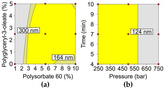 Design space (yellow region) of SC-NLC varying (a) Polysorbate 60:Polyglyceryl-3-dioleate ratio (b) and HPH parameters—pressure and time of processing.