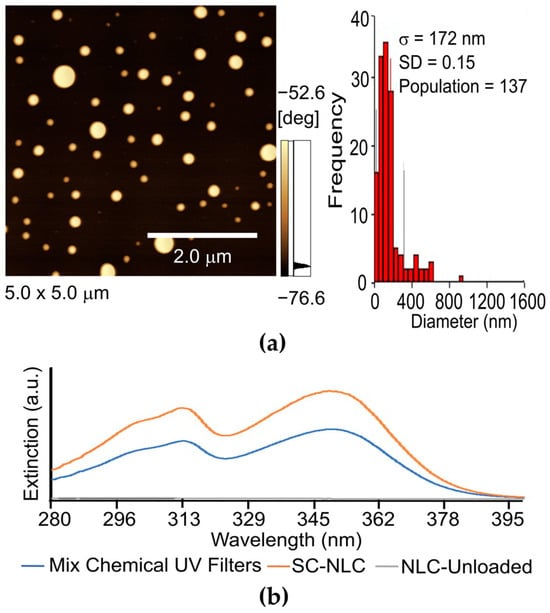 (a) AFM image, where the color scale shows that the brighter spots represent regions that are more exposed (in a higher position), and the darker fraction indicates the sample background. The scale shown in the image as reference is 2 µm. The histogram is resultant from a sum of several AFM images, showing the size frequency (non-normalized) of the optimized SC-NLC; (b) UV-Vis light extinction spectra of the mixtures of Uvinul® A Plus, Tinosorb® S, and Uvinul® T150 free and encapsulated in the SC-NLC, also of the mixture of the SC-NLC unloaded (no filters).