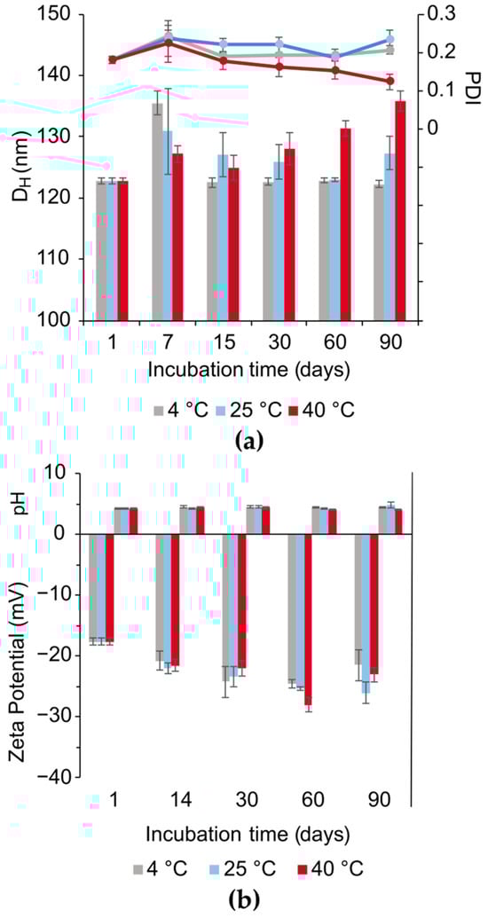 Evolution over time (in days) of SC-NLC’s (a) size (nm), PdI, (b) zeta potential (mV), and pH during three months under different incubation temperature conditions (4, 25, and 40 °C) and relative humidity of 75% (except for 4 °C). For the plot (a), the bars are referent to the particles’ hydrodynamic diameter (DH), and the lines express the PdI trend.
