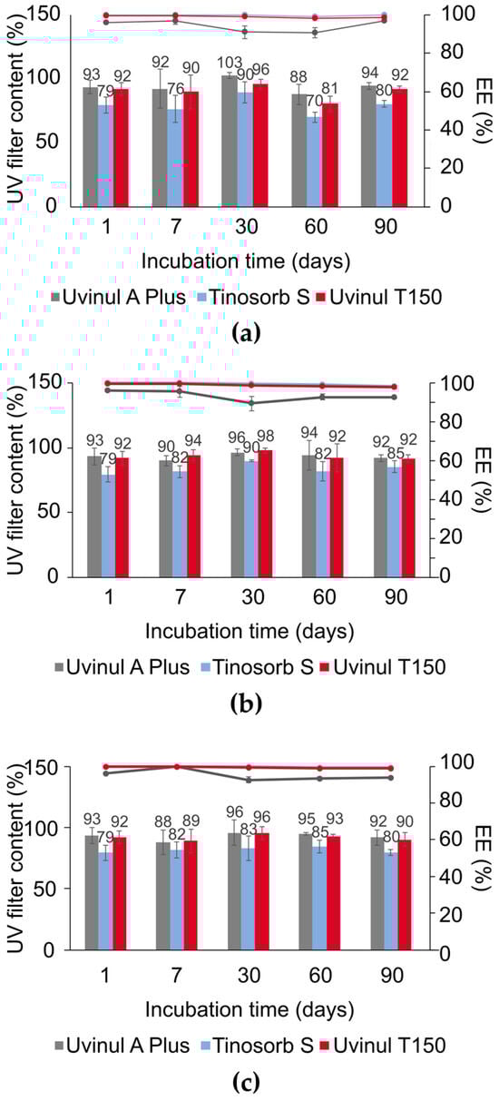 Figure 5 displays the results of UV filters’ total load and encapsulation efficiency. No significant loss of UV filter content was seen in any temperature condition during the first 90 days. For the evaluation of encapsulation efficiency (%EE), it was noticed that over 80% of each UV filter available in the formulation was entrapped into the SC-NLC’s structure throughout the entire experiment window and under all tested conditions.