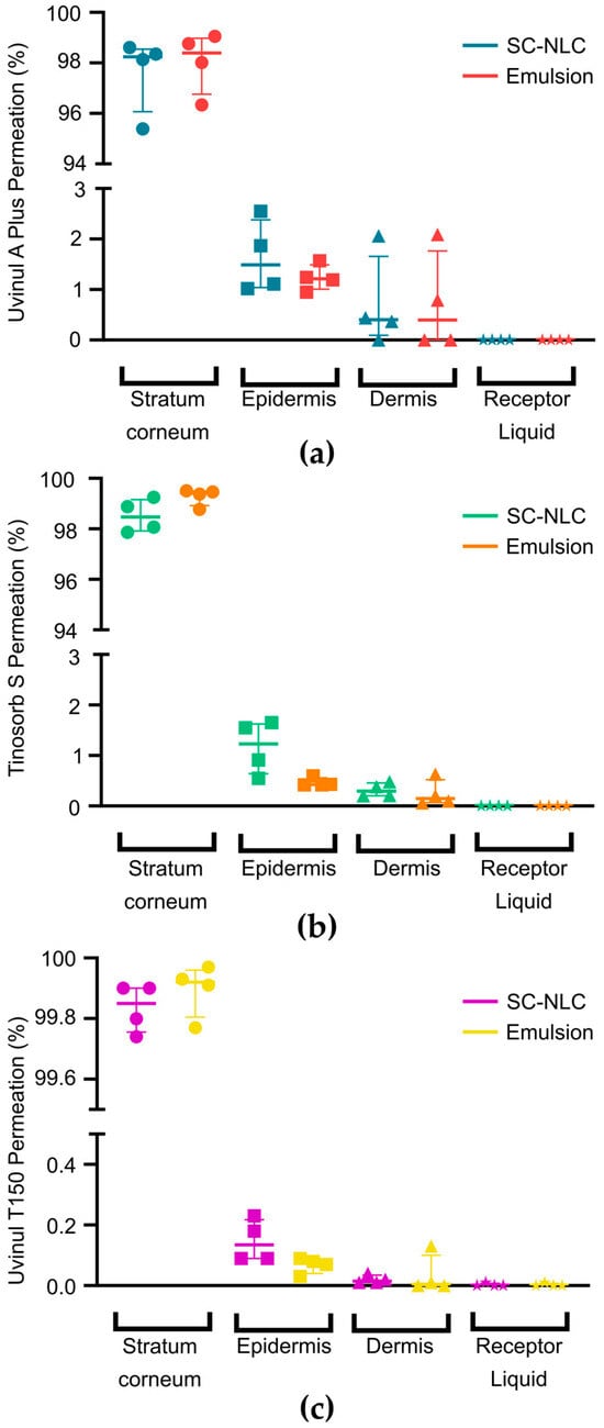 Since the use of NLCs can prolong the skin residence time of sunscreen products by preventing transepidermal water loss [], we sought to investigate whether this would impact the skin permeation of the filters in comparison to a pre-emulsion control (droplet size of approximately 5 µm). Figure 6 shows that for both samples, most of the filter content remained (>98%) in the skin surface and stratum corneum, in line with OECD 428 []. An equivalent permeation of all three filters was observed in the epidermis and dermis for both the SC-NLC and emulsion samples, and no filter was detected in the receptor liquid. In the epidermis, the concentration of Uvinul® A Plus, Tinosorb® S, and Uvinul® T150 was, respectively, 1.49%, 1.23%, and 0.14% for the SC-NLC group, and 1.21%, 0.43%, and 0.08% for the emulsion sample. In the dermis, the amount of filters was 0.40% (Uvinul® A Plus), 0.29% (Tinosorb® S), and 0.01 (Uvinul® T150) for the SC-NLC formulation, and 0.40% (Uvinul® A Plus), 0.15% (Tinosorb® S), and cca 0.00% (Uvinul® T150) for the emulsion. The concentration values found in each skin explant are presented in Table 3. The Kruskal–Wallis statistical test confirmed that no significant difference was observed in the skin permeation of the three evaluated filters between the SC-NLC or emulsion formulations. Hence, the nanometric dimensions of the SC-NLC did not lead to increased skin absorption of the filters, making it safe for further topical use. Although previous studies have confirmed that only nanostructures smaller than 36 nm would be able to diffuse through the nanopores (5–7 nm in healthy individuals) of the stratum corneum structure [,,], different mechanisms could allow the access of larger structures into deeper layers of the skin, such as the trans follicular route and extra skin hydration through occlusion. The latter could theoretically occur due to the nanoparticles’ presence, favoring skin penetration [,]. However, our findings do not corroborate this assumption, as also described by Puglia et al. (2014) []. The permeation observed for the SC-NLC was possibly hindered by the repulsion between the negative charges from the carrier surface (as indicated by the zeta potential data) and the stratum corneum lipid composition [,]. The stratum corneum acts as a highly efficient barrier that controls the penetration of molecules and microorganisms through the skin [,]. Additionally, the three chemical filters tested are highly lipophilic (logP > 5) and more likely to interact with the lipidic mass of the skin’s outer layer [], and the molecular weight of Tinosorb® S and Uvinul® T150 is higher than 500 Da, hampering their skin penetration [,].