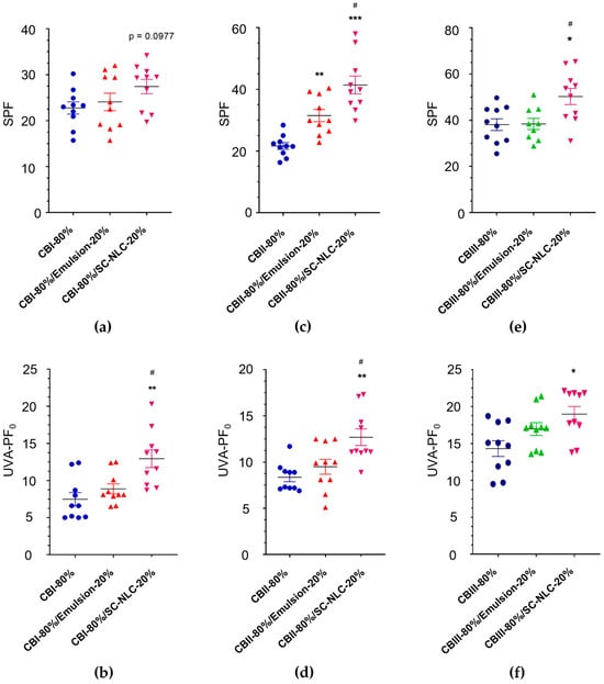 Photoprotection responses obtained in vivo tests assessing (a) SPF and (b) UVA-PF0 of CBI-80%, CBI-80%/Emulsion-20%, and CBI-80%/SC-NLC-20%; (c) SPF and (d) UVA-PF0 of CBII-80%, CBII-80%/Emulsion-20% and CBII-80%/SC-NLC-20%; and (e) SPF and (f) UVA-PF0 of CBIII-80%, CBIII-80%/Emulsion-20% and CBIII-80%/SC-NLC-20%. The results of SPF and UVA-PF0 are represented by their median, quartiles, and upper and bottom limits. The statistical difference was evaluated using the Brown–Forsythe and Welch ANOVA test followed by Dunnett’s T3 multiple comparisons test; it was considered significantly different when p < 0.05, and the symbols *, **, ***, and # indicate significant differences.