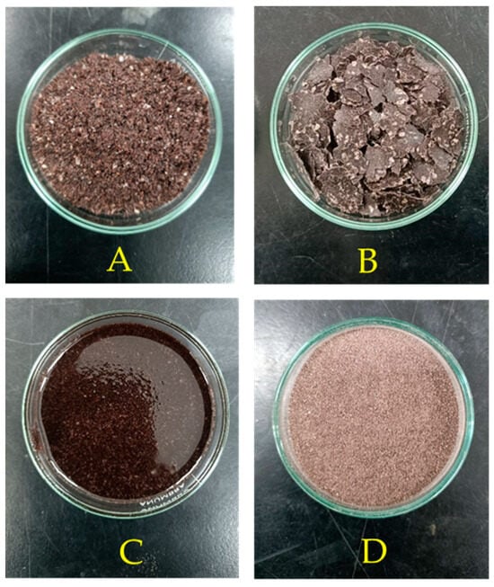 (A) Full-fatted rice bran (FFRB); (B) cold-pressed rice bran (CPRB); (C) crude rice bran oil (cRBO); (D) defatted rice bran (DFRB).