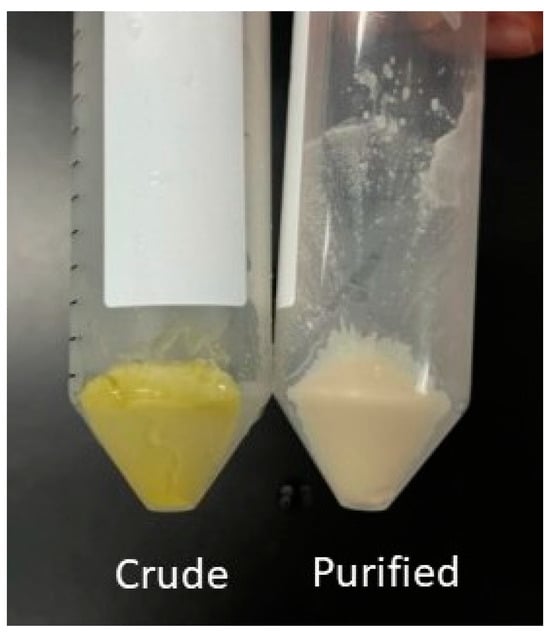 The winterization of 30.5 g of cRBO yielded 2.01 g (6.6%) of the crude rice bran wax (cRBW). The wax samples were subjected to multiple washing steps until light-colored, purified rice bran wax (RBW) was obtained (Figure 2). The melting range of the isolated RBW (76–79 °C) was slightly lower than those reported previously [,]. The saponification, acid, and iodine values of 70.97 ± 5.59, 10.44 ± 0.52, and 10.28 ± 0.74, respectively, were similar to those of rice bran wax previously reported by Basarkar [] (Table 1).
