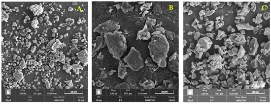 SEM images (3000×) of (A) full-fatted rice bran (FFRB); (B) KJ CMU107 rice bran wax (RBW); (C) commercial rice bran wax (NatureSoft 860 GMP).