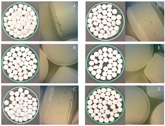 Macroscopic (left) and microscopic (right) appearances and remarks of the tablet formulations containing different lubricants. (A) Control (no lubricant); (B) 0.5% MGS; (C) 1.0% sFFRB; (D) 1.0% sDFRB; (E) 0.5% HVO; (F) 0.5% RBW.
