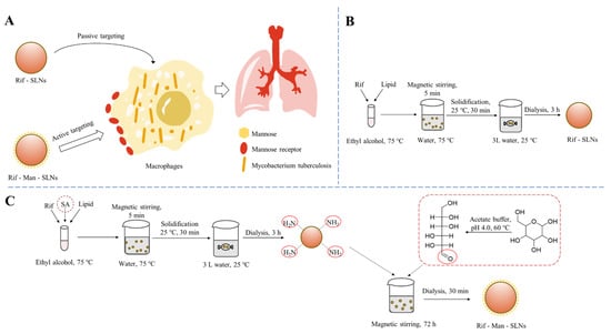 Tuberculosis is an extremely prevalent respiratory disease and the causative agents of tuberculosis often reside in the alveolar macrophages of lungs for a long period of time []. Recently, various carbohydrate-functionalized nanotherapeutics were exploited for macrophage targeted anti-tubercular drug delivery []. These could internalize the macrophages via overexpressed carbohydrate binding receptors and effectively suppress the invading microorganisms. The present study discussed the fabrication of mannose appended SLNs containing Rif and evaluated their effectiveness to accumulate the drug molecules inside the alveolar macrophages following endocytic uptake via the mannose receptor, a carbohydrate-binding receptor of the macrophage, for effective management of tuberculosis (Figure 1A) []. In other words, this could be accomplished through an active targeting process. On the contrary, passive targeting utilizes no homing device and uses only the natural distribution phenomenon of a carrier for drug targeting. In this context, Rif-loaded SLNs (Rif-SLNs) as control scaffolds were prepared using a solvent diffusion protocol, which involved the intense diffusion of solvent from the solvent–lipid phase into the surrounding aqueous phase followed by the evaporation of the organic solvent and solidification of lipid particles (Figure 1B) []. To afford Rif-Man-SLNs, SA was initially incorporated to provide amine terminated functionalities on Rif-SLNs. The coupling of mannose with these SLNs was then performed via Schiff bases chemistry, in which the aldehyde moieties of the ring-opened mannose could conjugate with the amino groups of SA present on the surfaces of drug-loaded SLNs (Figure 1C) [].