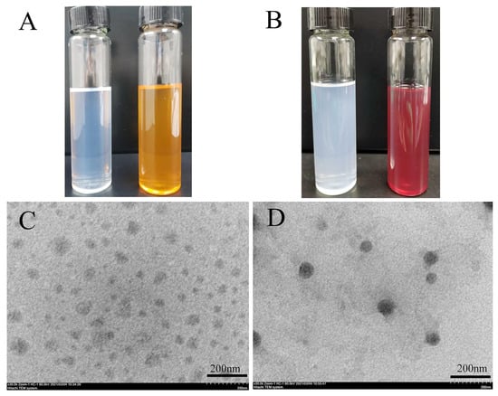 The physical appearances of the drug-loaded SLNs were examined as compared to the corresponding blank templates (Figure 2A,B). Blank SLNs exhibited a light bluish opalescence due to the typical Tyndall effect [], conferring the presence of abundant nanoparticles in the dispersions. On the other hand, drug-loaded SLNs appeared in different colors because of the presence of red-colored Rif molecules in the nanoparticles. Mannose-anchored and unmodified SLNs were further characterized in terms of their size, uniformity, zeta potential and morphology. The average hydrodynamic diameter of mannose-free SLNs was 167.7 ± 12.2 nm with a unimodal size distribution (PDI values, 0.19) (Table 1), while the mannose-modified SLNs exhibited a bigger particle size of 196.5 ± 15.5 nm []. Mannose conjugation could also enhance the PDI values (~0.320), indicating a higher heterogeneous characteristic of Rif-Man-SLNs compared to parent SLNs (Table 1) []. The zeta potential value of unmodified SLNs was about −24 mV. This was accredited to the existence of anionic charges on the outer layers of the SLNs owing to the presence of terminal carboxylic groups of the lipids []. The high zeta potential value of Rif-SLNs ensured the stability of the colloidal dispersions because of the electrostatic repulsions []. The functionalization of Rif-SLNs with mannose caused a highly positive zeta potential value (+42 mV) due to the existence of SA, a strong positively charged substance, in their nanoarchitectures []. This was consistent with the earlier reports []. Rif-SLNs exhibited an extremely high drug loading of 20.4 ± 0.7% with a DEE of 88.3 ± 3.2%, which was ascribed to the speedy configuration of rigid lipid nanoparticles, eventually restricting Rif leakage from the matrices []. The inclusion of SA into Rif-Man-SLNs conferred significantly reduced drug entrapment than the corresponding control matrices (Rif-SLNs) (p< 0.05). This was credited to the formation of leaky matrices (Rif-Man-SLNs) due to the presence of SA, causing extravasation of Rif molecules in the aqueous medium during their preparation. This was well collaborated with the previous report []. The TEM images of Rif-loaded SLNs showed spherical particles (Figure 2C,D). Their average size in TEM was slightly smaller compared to the DLS results, which could be due to their dehydrated state in the TEM grid.