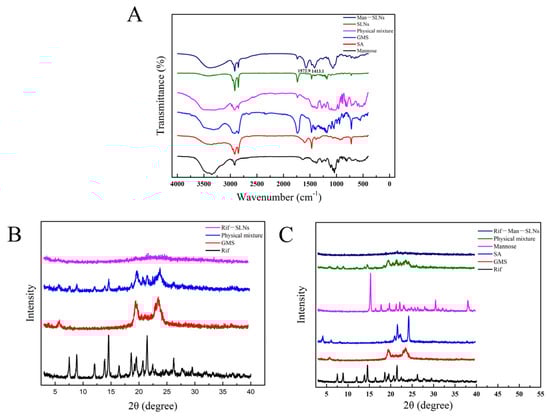 FT-IR overlay spectra of mannose, SA, GMS, physical mixture, SLNs, Man–SLNs (A). XRD patterns of Rif, GMS, physical mixture, Rif–SLNs (B) and XRD patterns of Rif, GMS, SA, mannose, physical mixture, Rif–Man–SLNs (C).