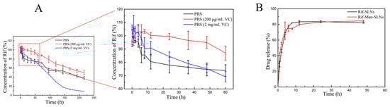 The stability of pure Rif in PBS media containing different amounts of VC (A). The in vitro release profiles of Rif from Rif-SLNs and Rif-Man-SLNs in PBS containing 200 μg/mL of VC (B) (n = 3, Mean ± SD).