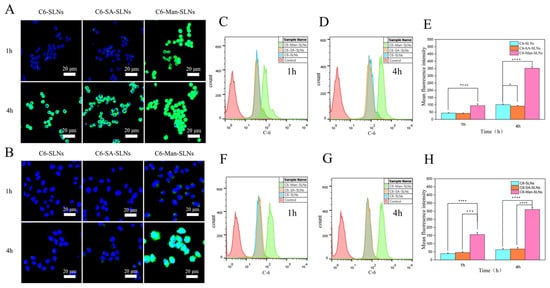 Cellular internalization of C6-SLNs, C6-SA-SLNs and C6-Man-SLNs on Raw 264.7 cells (A) and A549 cells (B) analyzed using CLSM. Cellular uptake efficiency of SLNs recorded by flow cytometry (C,D,F,G) and quantitative evaluation of their signals (E,H). Statistical significance levels are indicated as: * (p < 0.05); *** (p < 0.001); **** (p < 0.0001).