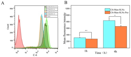 We further attempted to examine the cellular uptake abilities of Man-SLNs on Raw 264.7 cells preincubated with or without free mannose by flow cytometry analyses (Figure 6). When the cells were preincubated with free mannose, the cellular uptake of Man-SLNs was remarkably reduced (p < 0.05) (Figure 6A,B). Free mannose could competitively inhibit the mannose receptors present on the cell surfaces and block the uptake of Man-SLNs by reducing receptor availability []. This implied that the cellular internalization of Man-SLNs could take place via mannose receptor-mediated endocytosis as well as non-specific adsorption-mediated trafficking [].