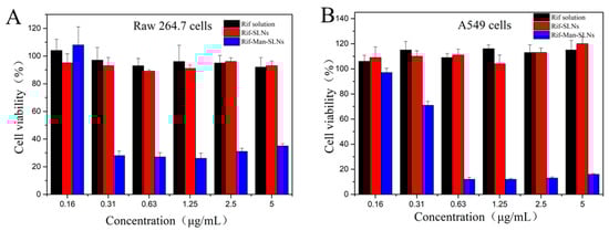 The cytotoxic potentials of pure Rif, Rif-SLNs and Rif-Man-SLNs were evaluated on two different cells (Raw264.7 and A549) by MTT assay protocol after 24 h of incubation (Figure 7) []. Pristine Rif and Rif-SLNs did not show cytotoxicity against Raw264.7 and A549 cells, with average cell viability around 100%. In contrast, Rif-Man-SLNs containing similar drug concentration ranges displayed varying degrees of cytotoxicity on both the cell lines. The cytotoxicity of Rif-Man-SLNs was increased with raising the loaded drug concentrations. Possibly, the presence of the positively charged substance SA in Rif-Man-SLNs could enhance their cytotoxicity []. In addition, the mannose-modified SLNs showed a greater cellular uptake efficiency, causing a higher cytotoxicity on Raw264.7 and A549 cells [].