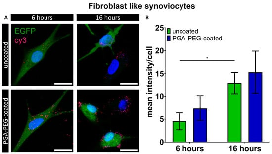 Overview of nanoparticle co-localization of uncoated and PGA-PEG-coated nanoparticles after 6 and 16 h of transfection in fibroblast-like synoviocytes. (A) Exemplary maximum projection of Z-stack showing internalization of cy3-siRNA-carrying nanoparticles (red) in FLS cells for uncoated and PEG-coated nanoparticles. Green: EGFP expression. Nuclei in blue (Hoechst), scale bar: 20 µm. (B) Graphical summary of mean cy3 intensity/cell. Means and SD. Statistical significance (p ≤ 0.05) is displayed by * above the line.