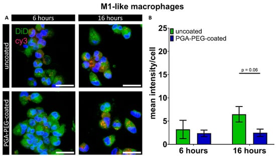 In M1-like macrophages, internalization was also observed. For uncoated nanoparticles, cy3 mean intensities of 3.2 ± 1.9 and 6.5 ± 1.7 were measured (Figure 4B), whereas for PGA-PEG-coated nanoparticles, mean intensities of 2.4 ± 0.7 and 2.5 ± 0.7 were observed, after 6 and 16 h, respectively (Figure 4B). Due to cell-type-specific cell autofluorescence cut-offs in the range of Cy3 emission determined by imaging the non-transfected control of the according cell type in this analysis, a direct comparison between cell types was not performed.