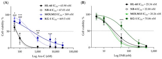 Viability of AML cell lines in response to chemotherapy. Dose-response curves and IC50 values for HL-60, NB-4, MOLM13, and KG-1 cell lines treated with (A) cytarabine (Ara-C) and (B) daunorubicin (DNR). Values are expressed as cell viability relative to vehicle-treated cells normalized to 100%. Values are given as mean ± SD. Two-way ANOVA followed by Sidak’s Multiple Comparison Test: *, p ≤ 0.05; ## p ≤ 0.01; ***, ### p ≤ 0.001. Comparing all cell lines with the KG-1 (*) or the MOLM13 (#) cell line. Results are from at least three independent experiments with two replicates each.