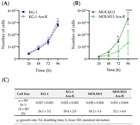 Cell growth rates and doubling times of AML Ara-R resistant and parental cell lines. Cell growth curves of (A) KG-1 and KG-1 Ara-R and (B) MOLM13 and MOLM13 Ara-R were analyzed over multiple population doublings. 2.5 × 104 cells were plated, and cells were counted every 24 h using Trypan blue dye. (C) Values of growth rates (µ) and doubling times (Td) were calculated from the respective line equations (Figure S2). Statistical significance was determined by two-way ANOVA followed by Sidak’s Multiple Comparison Test. * p ≤ 0.05; *** p ≤ 0.001. At least three independent experiments with three replicates were performed.