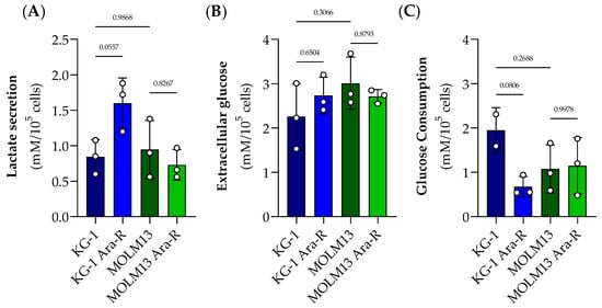 Lactate secretion and glucose consumption in parental and Ara-R cell lines. (A) Levels of lactate secretion and (B) extracellular glucose were evaluated at 4 h for KG-1, KG-1 Ara-R, MOLM13, and MOLM13 Ara-R cells. (C) Glucose consumption corresponds to the difference in glucose concentration between 0 h and 4 h of incubation (Figure S6). Results are presented as mean ± SD of at least three independent experiments. Statistical significance estimated by two-way ANOVA followed by Sidak’s Multiple Comparison Test.