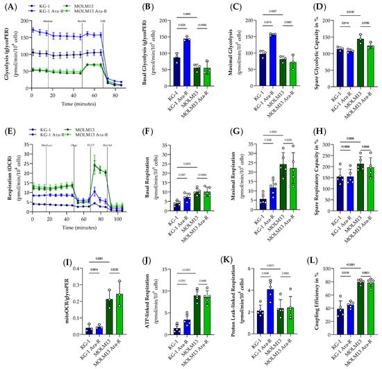 Characterization of the glycolytic and respiratory profile in parental and Ara-R cell lines. Results of the Glycolytic rate (A) and Mito Stress (E) test in KG-1, KG-1 Ara-R, MOLM13, and MOLM13 Ara-R cells are presented as real-time measurements of glycolytic proton efflux rate (glycoPER) and oxygen consumption rate (OCR) normalized to cell number, respectively. (B) Basal glycolysis, (C) maximal glycolysis, (D) glycolytic reverse in %, (F) basal respiration, (G) maximal respiration, (H) spare respiratory capacity in %, (I) ratio of respiration to glycolysis, (J) ATP-linked respiration, (K) proton leak-linked respiration, (L) coupling efficiency in %. Values are given as mean ± SD. One-way ANOVA followed by Sidak’s Multiple Comparison Test. At least three independent measurements with 2 to 8 replicates were performed for each cell line. Treatments: 2.5 µM Oligomycin (Oligo.); 0.5 µM fluoro-carbonyl cyanide phenylhydrazone (FCCP); 0.5 µM Rotenone and Antimycin A (Rot/AA); 50 mM 2-Deoxy-d-glucose (2DG).
