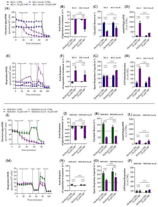 Effect of 3-bromopyruvate (3-BP) on glycolysis and respiration in parental and Ara-R cell lines. Results of the Glycolytic rate (A,I) and Mito Stress (E,M) test in (A–H)) KG-1, KG-1 Ara-R, (I–P) MOLM13, and MOLM13 Ara-R cells are presented as real-time measurements of glycolytic proton efflux rate (glycoPER) and oxygen consumption rate (OCR) normalized to cell number. (B,J) acute response of glycolysis to 3-BP, (C,K) glycolytic reserve in %, (D,L) ratio of respiration to glycolysis. (F,N) acute response of respiration to 3-BP, (G,O) spare respiratory capacity in %, (H,P) ATP-linked respiration. Values were given as mean ± SD. One-way ANOVA followed by Sidak’s Multiple Comparison Test. Two independent measurements with 2 to 6 replicates were performed for each cell line. Treatments: 2.5 µM Oligomycin (Oligo.); 0.5 µM fluorocarbonyl cyanide phenylhydrazone (FCCP); 0.5 µM Rotenone and Antimycin A (Rot/AA); 50 mM 2-Deoxy-d-glucose (2DG).