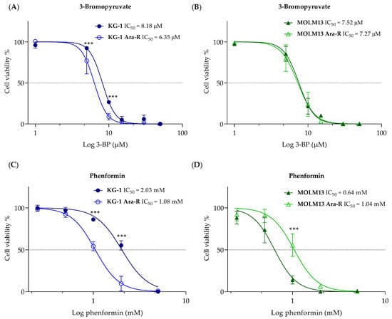Effect of 3-bromopyruvate (3-BP) and phenformin on Ara-C-resistant and parental cell viability. Dose-response curve to generate IC50 values of (A,C) KG-1 and KG-1 Ara-R cell lines and (B,D) MOLM13 and MOLM13 Ara-R cell lines in response to (A,B) 3-BP, and (C,D) phenformin. Values are expressed as cell viability relative to vehicle-treated cells normalized to 100%. Values are given as mean ± SD. Two-way ANOVA followed by Sidak’s Multiple Comparison Test. *** p < 0.001. At least three independent experiments with two replicates were performed.