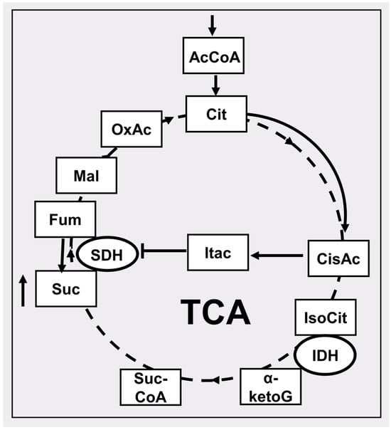 Particular features of the tricarboxylic acid cycle (TCA) in conditions of limited access to oxygen associated with the accumulation of succinate. The dotted lines show the reactions of the conventional course of the Krebs cycle under aerobic conditions. Solid lines show the course of reactions under hypoxic conditions leading to the accumulation of succinate. AcCoA, acetyl CoA; Cit, citrate; cisAc, cis-aconitate; Itac, itaconate; IsoCit, isocitrate; IDH, isocitrate dehydrogenase; α-ketoG, α-ketoglutarate; SucCoA, succinateCoA; Suc, succinate; SDH, succinate dehydrogenase; Fum, fumarate; Mal, malate, OxAc, oxaloacetate. The up arrow near the succinate box indicates an increase in its level.