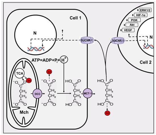 The minimal scheme of succinate signaling. Two cells (1 and 2) are given, one of which, due to several influences, becomes a super producer of succinate. From the mitochondria (Mch), where succinate is primarily formed, it exits into the cytosol through the dicarboxylate carrier DCC. Succinate leaves the cell in a protonated form through the MCT-1 transporter, and in a cell in which the pH is low (hypoxic or cancerous), the probability of succinate protonation is high. Acidification of the cytosol is mainly determined by the ATPase reaction. Extracellular succinate interacts with the SUCNR-1 of both the donor and surrounding cells, triggering expression of several genes in the nucleus (N) and the up arrows near the boxes indicate an increase in their levels. SA, succinylated protein adduct mediated by succinyl CoA formed in Krebs cycle and amino acid metabolism (see the text).