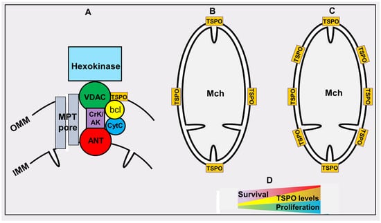 Tryptophan-rich-sensory protein (TSPO)/peripheral (mitochondrial) benzodiazepine receptor. OMM and IMM, outer and inner membranes of mitochondria (Mch), respectively. (A) the architecture of the TSPO environment: voltage dependent anion channel (VDAC); creatine kinase/adenylate kinase (CrK/AK); adenine nucleotide transporter (ANT), bcl-2 and bcl-xl (bcl); mitochondrial permeability transition pore (MPT pore). (B,C) relative levels of TSPO in normal and highly proliferating cells correspondingly. (D) the relationship between TSPO levels and cancer cell proliferation and survival of cancer patients.